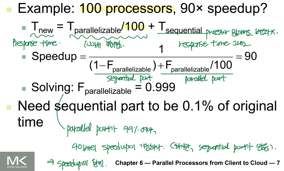: 프로세서 개수를 늘릴 때 성능향상을 가져오기 위해서는, 즉 연산 속도를 빠르게 하기 위해서는 parallel part의 비율이 엄청나게 높아야 한다. 그런데 어쩔 수 없는 sequential part는 항상 존재한다.