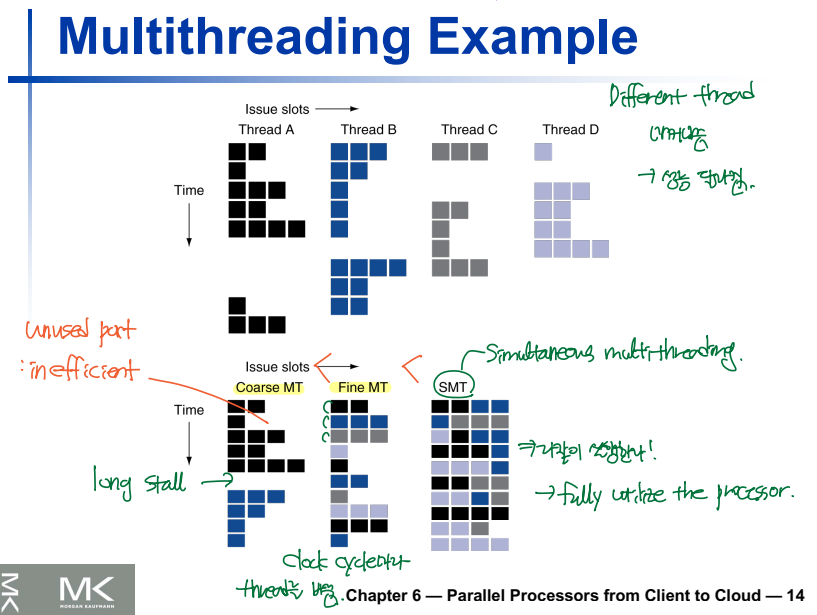 - Simultaneous multithreading: 여러 thread가 clock cycle과 관련없이 동시에 실행된다.