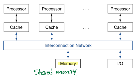 - Shared memory: 여러 개의 프로세서가 하나의 메모리를 공유한다.