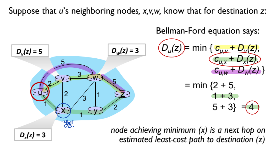 - Bellman-Ford 방식: 각각의 이웃(v, x, w)이 목적지(z)로 얼마만에 갈 수 있는지를 알아야 한다. (세상 모든 목적지에 대해!)