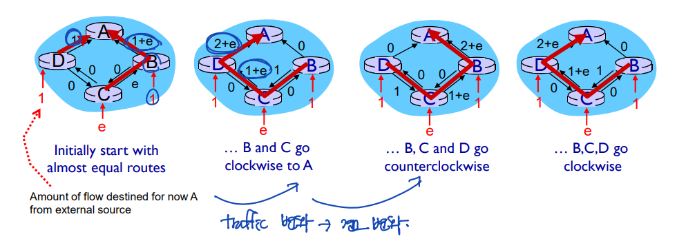 : 매번 cost가 바뀜에 따라(dynamic), packet이 서로 다른 경로에 의해 전송된다. (out of order delivery)