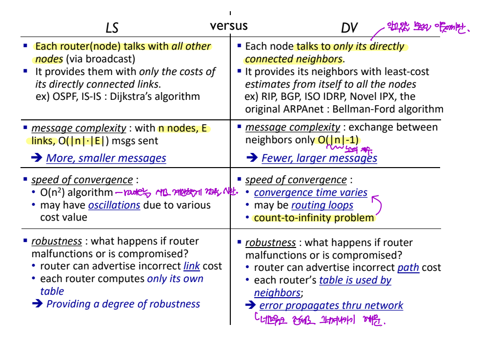 - LS: O(n*E) --> More, smaller messages (더 많은 router들에게, 작은 메시지를 보낸다.)