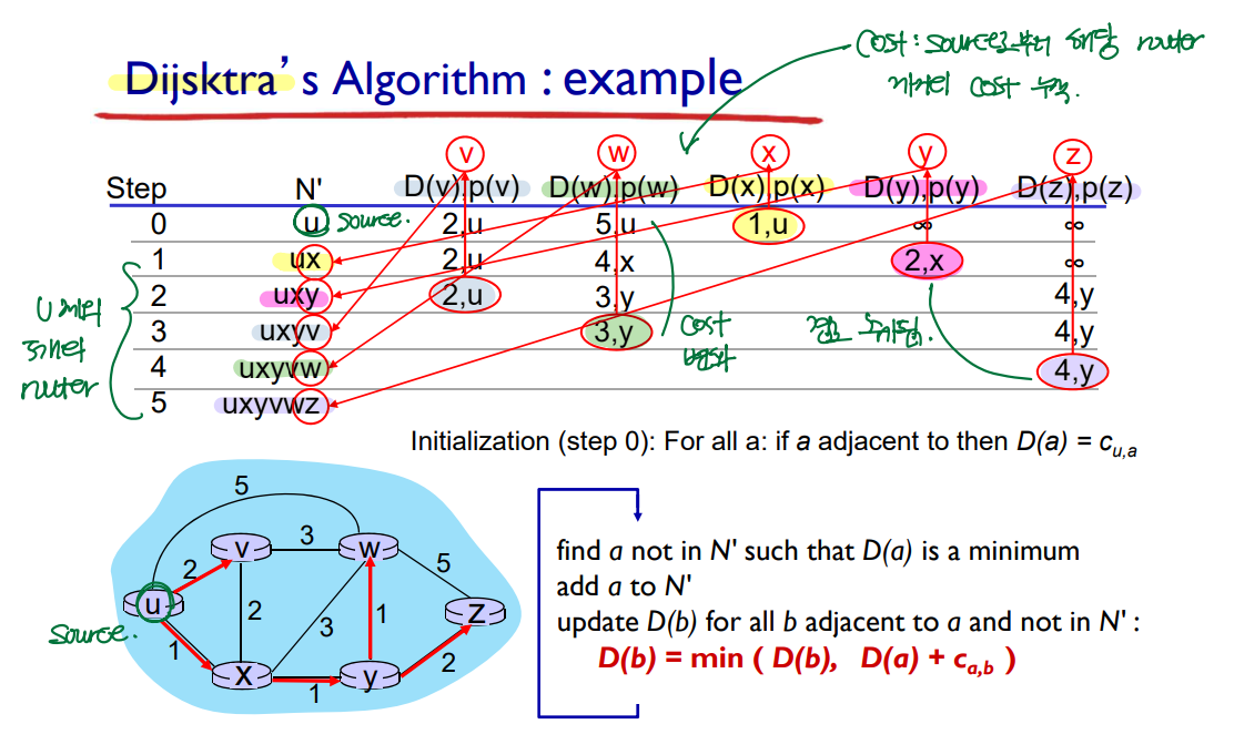- 목적지로의 cost는 새로운 노드가 N'에 추가될 때마다 업데이트된다.