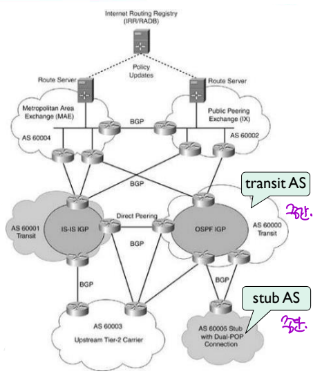 : 실질적으로는 각 AS에 마다 자신만의 고유한 routing protocol을 갖는다.