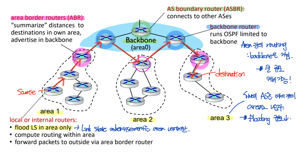 - 만약 서로 다른 area 사이의 router에서 전송을 하고 싶다면: area의 ABR을 거쳐, backbone의 backbone router를 거쳐, 다른 area로 이동해야 한다.