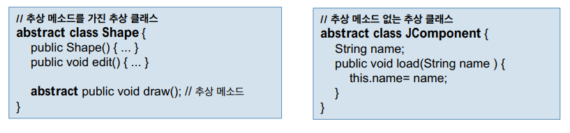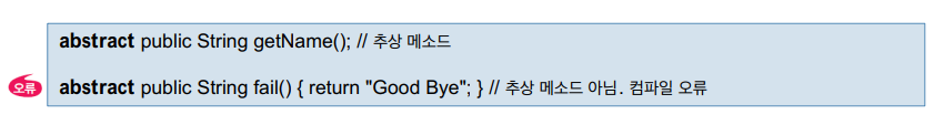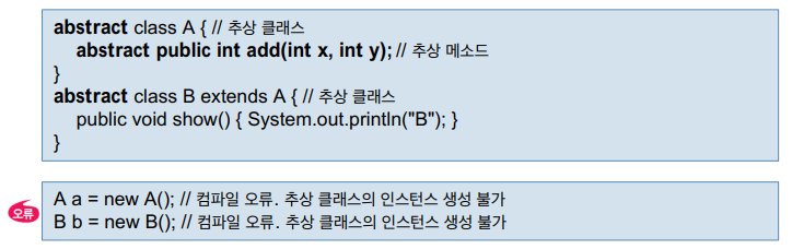 : 응용프로그램에서는 추상 클래스의 인스턴스(객체)를 생성할 수 없다. 이는 추상 클래스에는 실행 코드가 없는 미완성 상태인 추상 메소드가 있을 수 있기 때문이다.