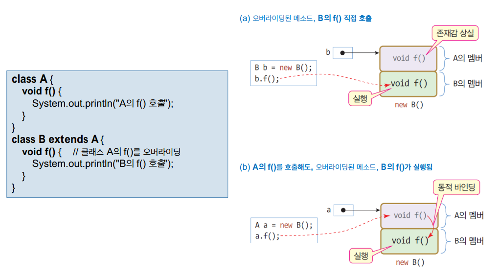 : 서브 클래스에서 슈퍼 클래스에 선언된 메소드를 중복 작성하여, 슈퍼 클래스에 작성된 메소드를 무력화시키고, 객체의 주인 노릇을 하는 것