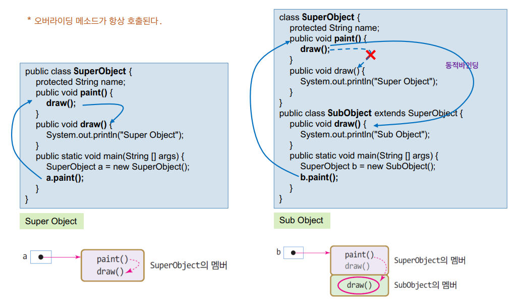 --> 슈퍼 클래스의 레퍼런스를 이용하든, 서브 클래스의 레퍼런스를 이용하든 항상 서브 클래스에 오버리이딩한 메소드가 실행된다.