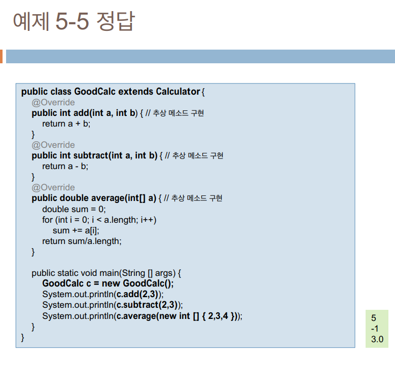 System.out.println("3과 5를 더하면 " + phone.calculate(3, 5)); // extends Calc