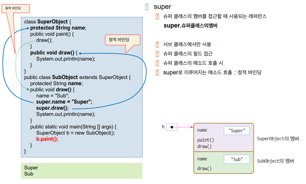 : 클래스에서 super 키워드를 이용하면 정적 바이딩을 통해 슈퍼클래스의 멤버에 접근할 수 있다.
