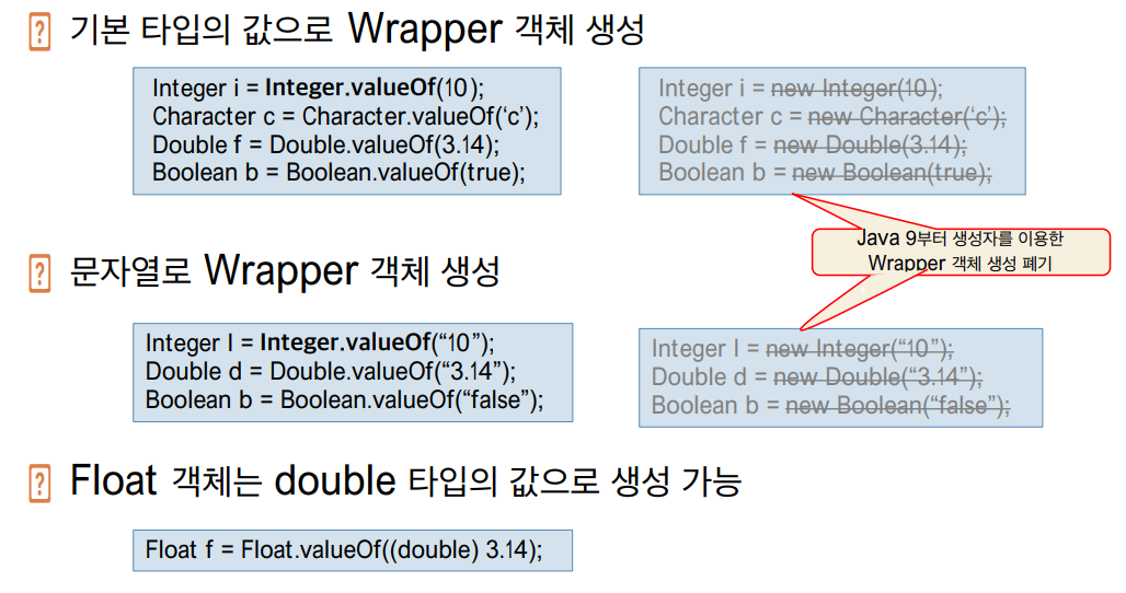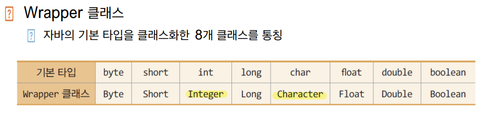 - 언박싱(unboxing): Wrapper 객체에 들어있는 기본 타입의 값을 빼내는 것