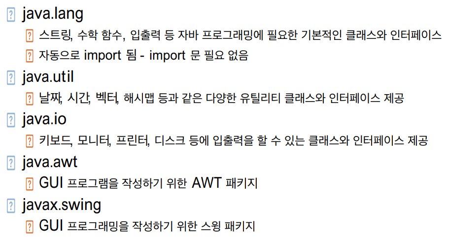 : 화면 출력, 키 입력, 네트워킹 등 프로그램 개발에 필요한 기본적인 기능과 다양한 응용 기능을 구현한 많은 클래스와 인터페이스들을 포함하는 표준 패키지를 제공한다.
