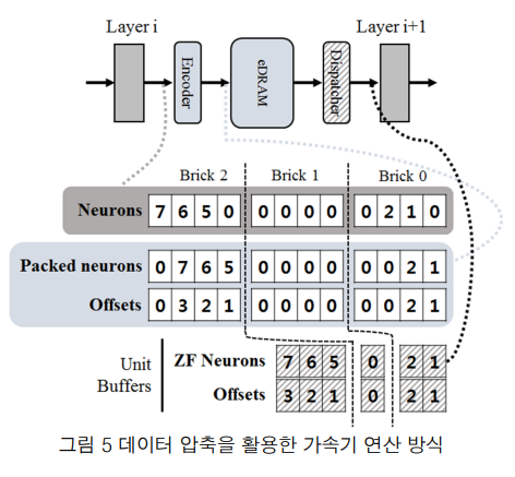 따라서 이러한 데이터의 0값을 제거하기 위해 데이터 압축 기술이 제안되었다. 압축 기술은 각 층의 연산을 수행하기 전, 이전 층의 non-zero 뉴런만을 따로 저장하는 버퍼를 추가하여 0값을 제거한다. 0값을 제거함으로 인해 현 층에서 불필요한 연산을 수행하지 않기 때문에 인공신경망 연산성능이 향상된다.