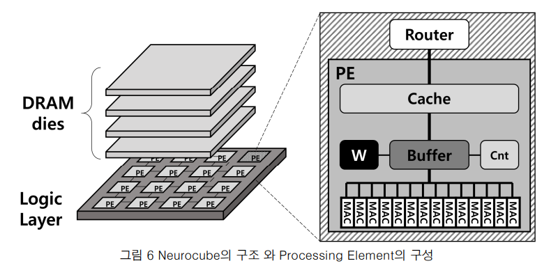 Hybrid Memory Cube(HMC)는 연산장치로 이루어진 logic layer 위에 DRAM을 3차원으로 쌓은 구조다. HMC 구조의 메모리 시스템은 메모리 대역폭이 넓기 때문에, DNN 연산에서의 메모리 병목 현상으로 인한 연산 성능 하락을 최소화하기에 적합하다.