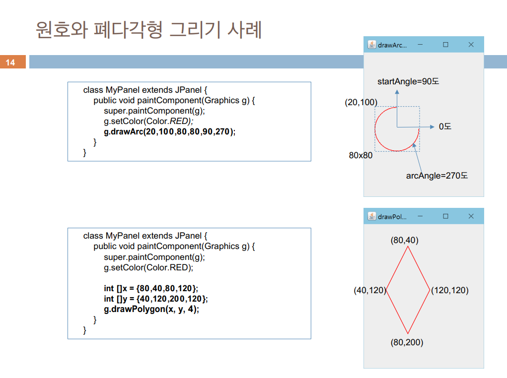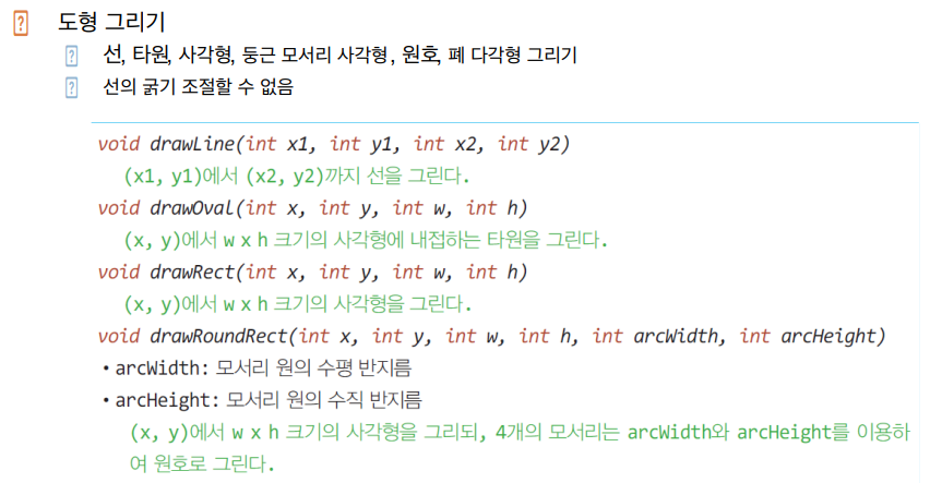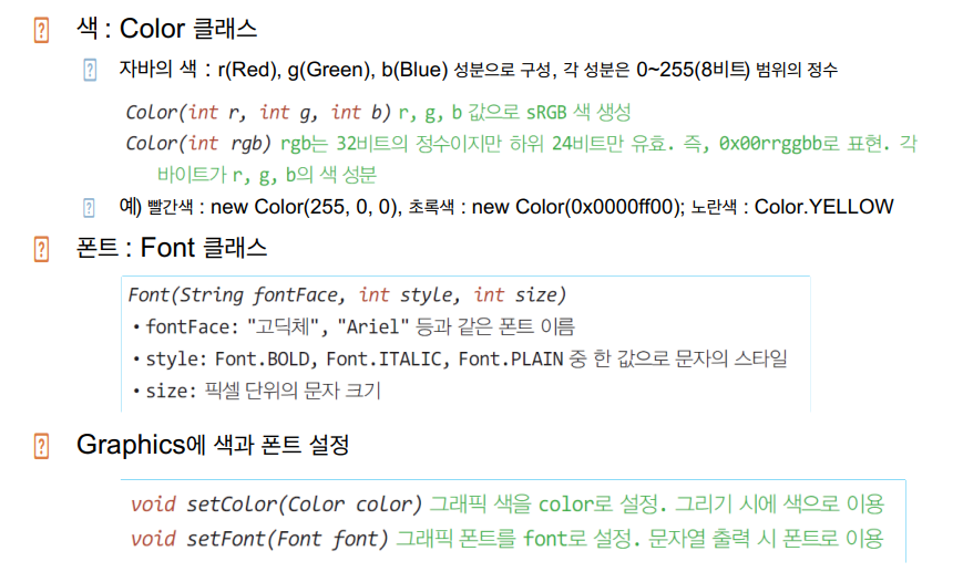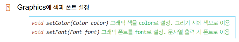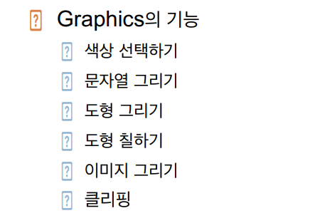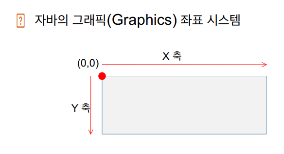 ▶ 그래픽: 개발자가 스윙 컴포넌트에 의존하지 않고 선, 원, 이미지 등을 이용하여 직접 화면을 구성하는 기능