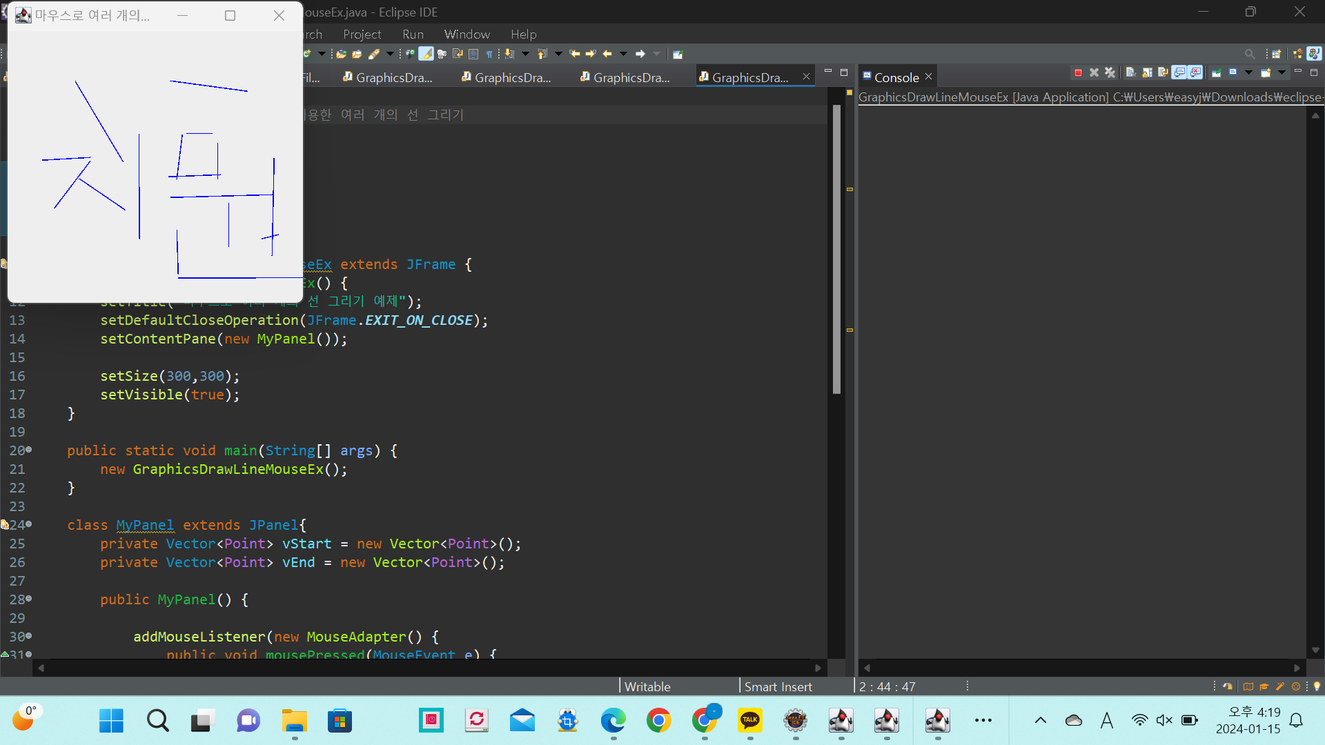 * 예제 11-8: repaint()와 마우스를 이용한 여러 개의 선 그리기