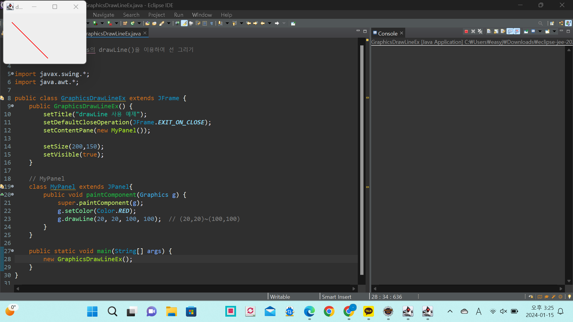 * 예제 11-3: Graphics의 drawLine()을 이용하여 선 그리기