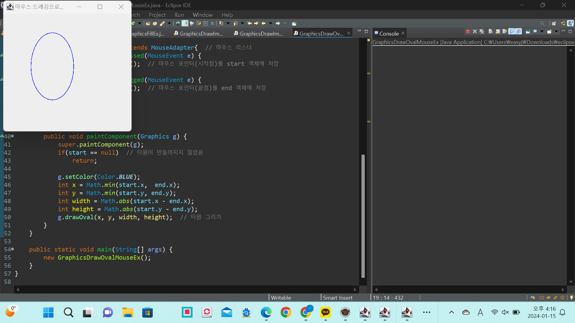 setTitle("마우스 드래깅으로 타원 그리기 예제");